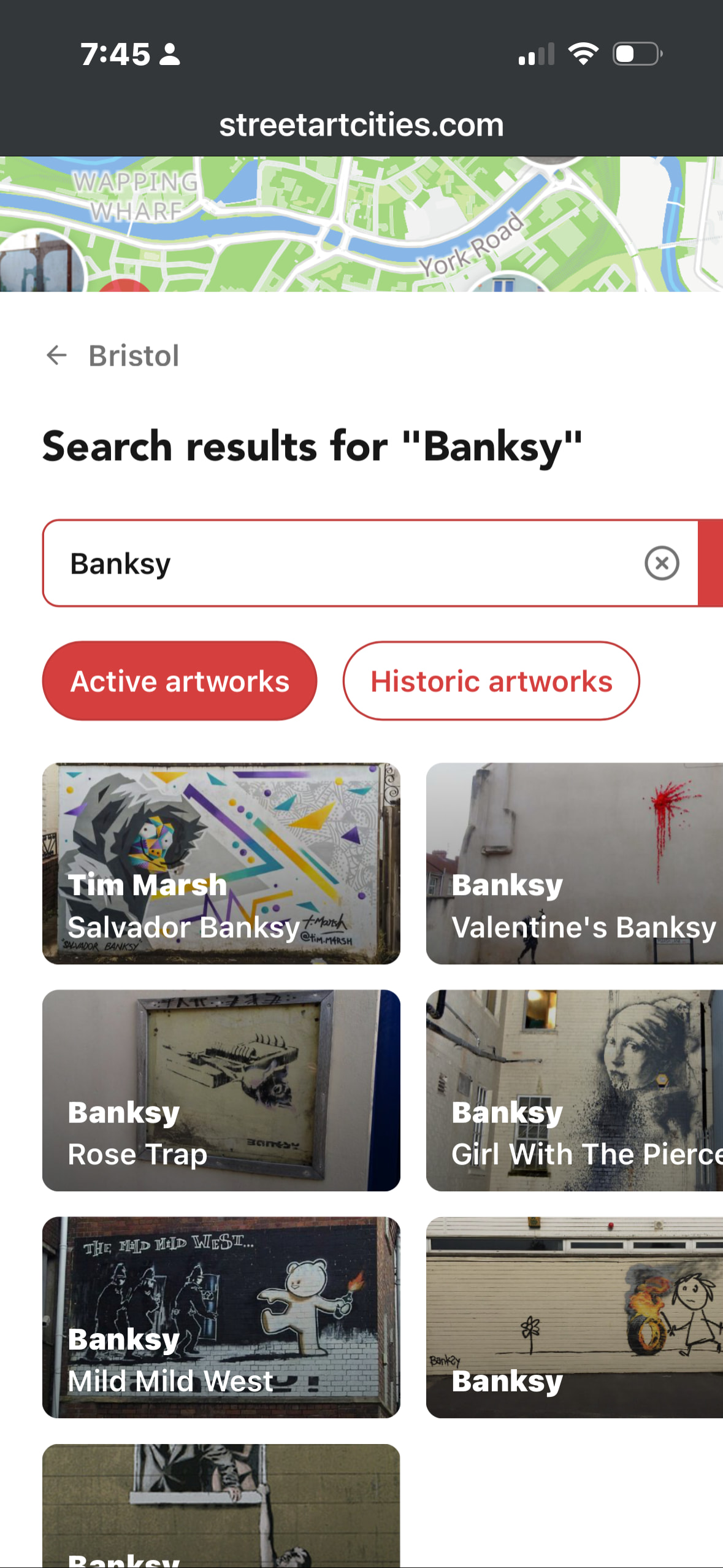 If i do a search for Banksy, I do get a fantastic list of locations, and the Hanging Man does give me a map location…