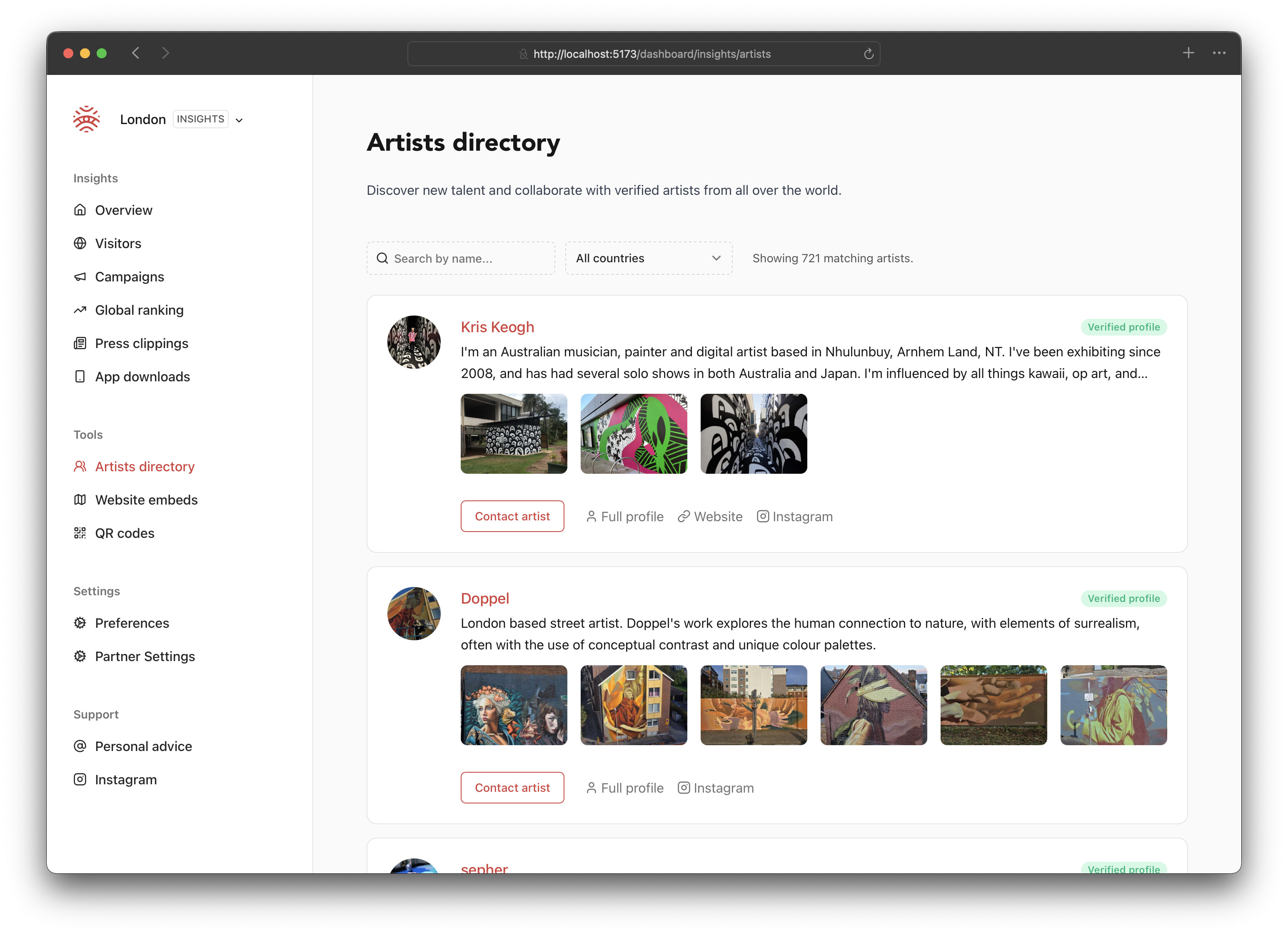 We’re excited to share a brand new addition to the Street Art Cities platform: the artists directory in the insights dashboard for our official partners!
