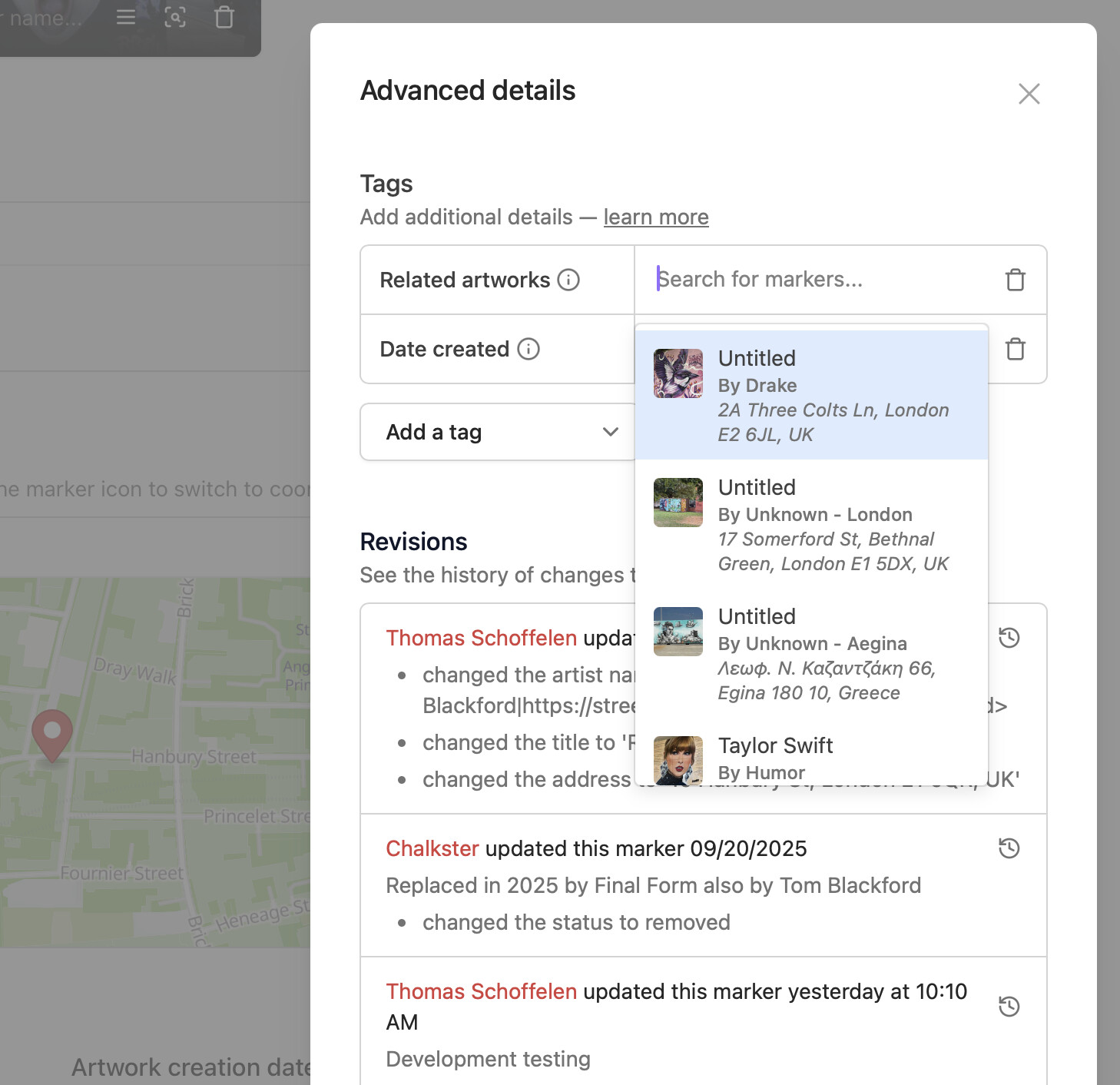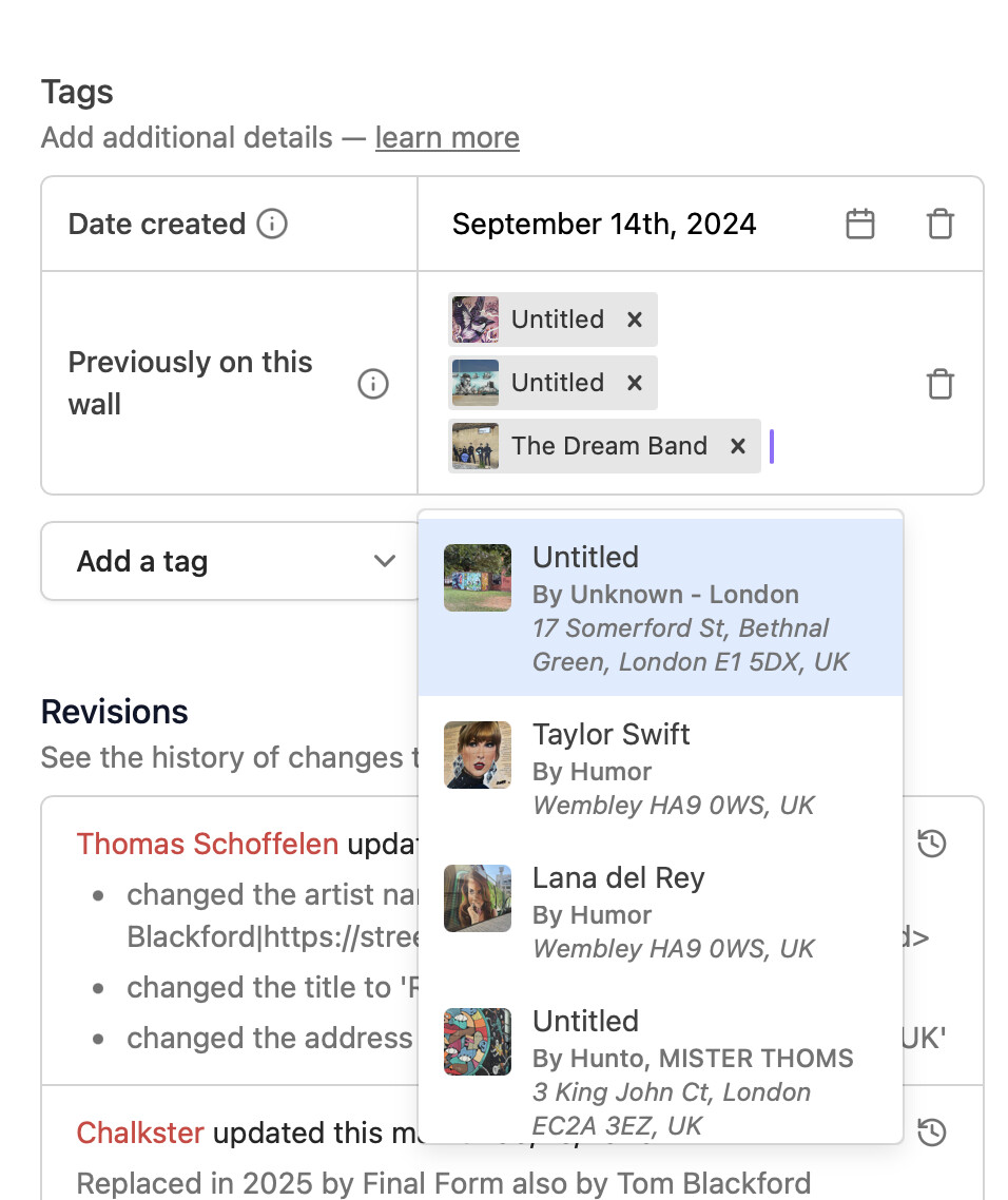 We’ve made it easier to connect artworks and tell the stories of our city walls! You can now link artworks together in the dashboard, with new tags for “Related artworks” and “Previously on this wall.” This means you can show the journey of an artwork or a wall, helping everyone explore the history and connections in our street art scene.