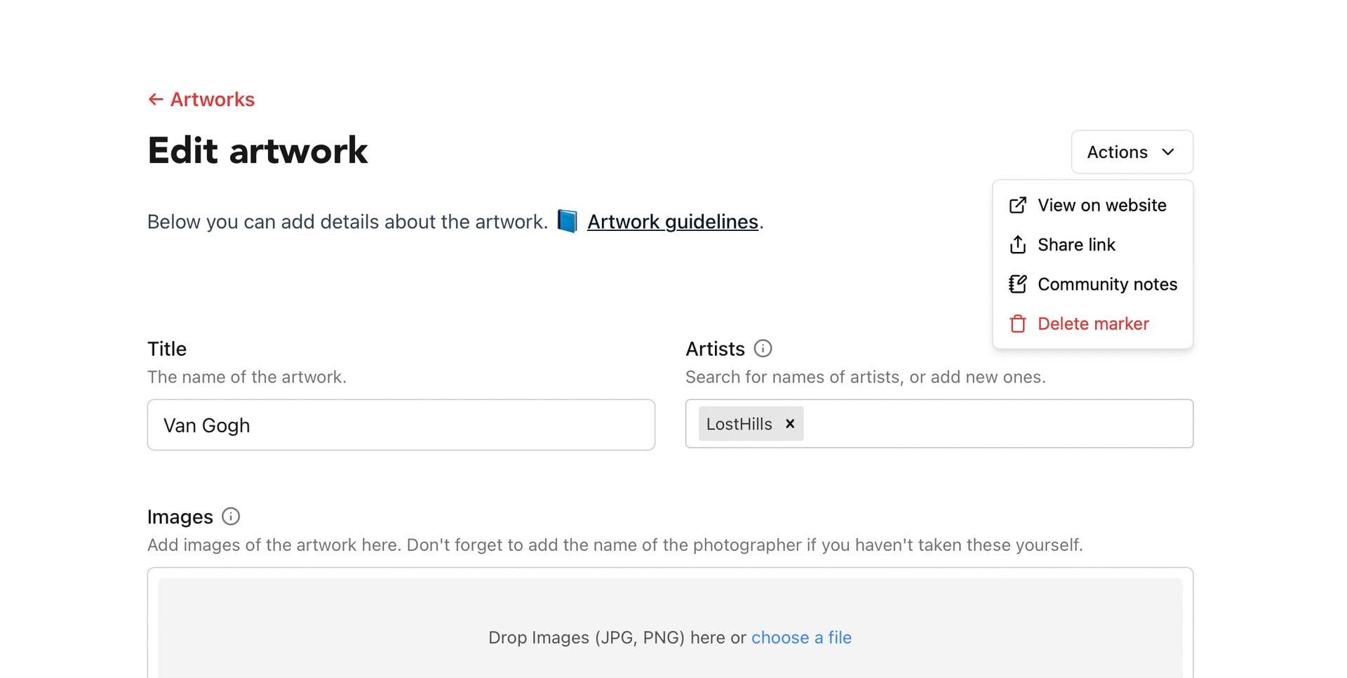I’ve introduced a new little dropdown menu on the ‘Edit artwork’ page, which allows you to quickly view the marker on the website, and see community notes.