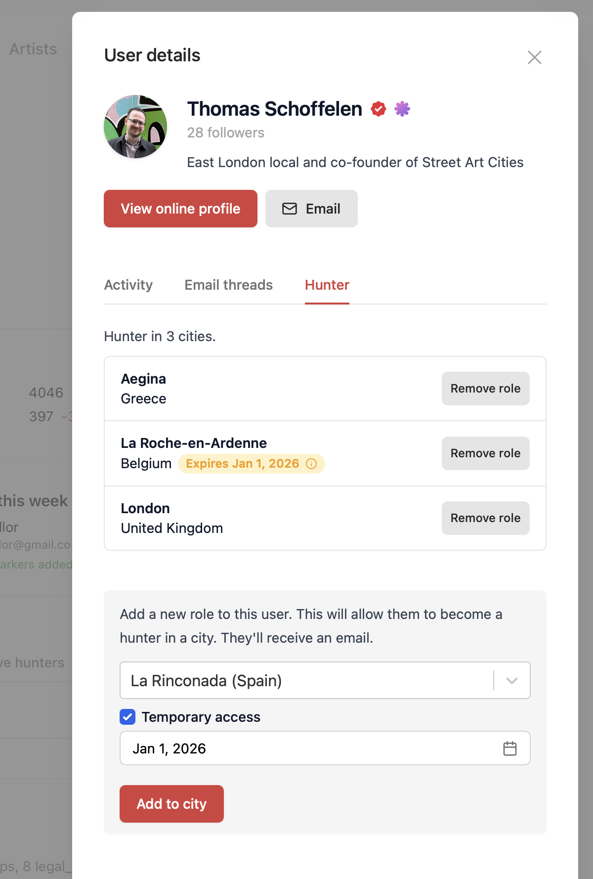 We’ve just updated the Country Manager dashboard with a handy new feature: you can now give hunters temporary access to a city, perfect for things like holiday hunting or special events. When adding a new hunter, you can set an expiry date for their access directly in the dashboard.