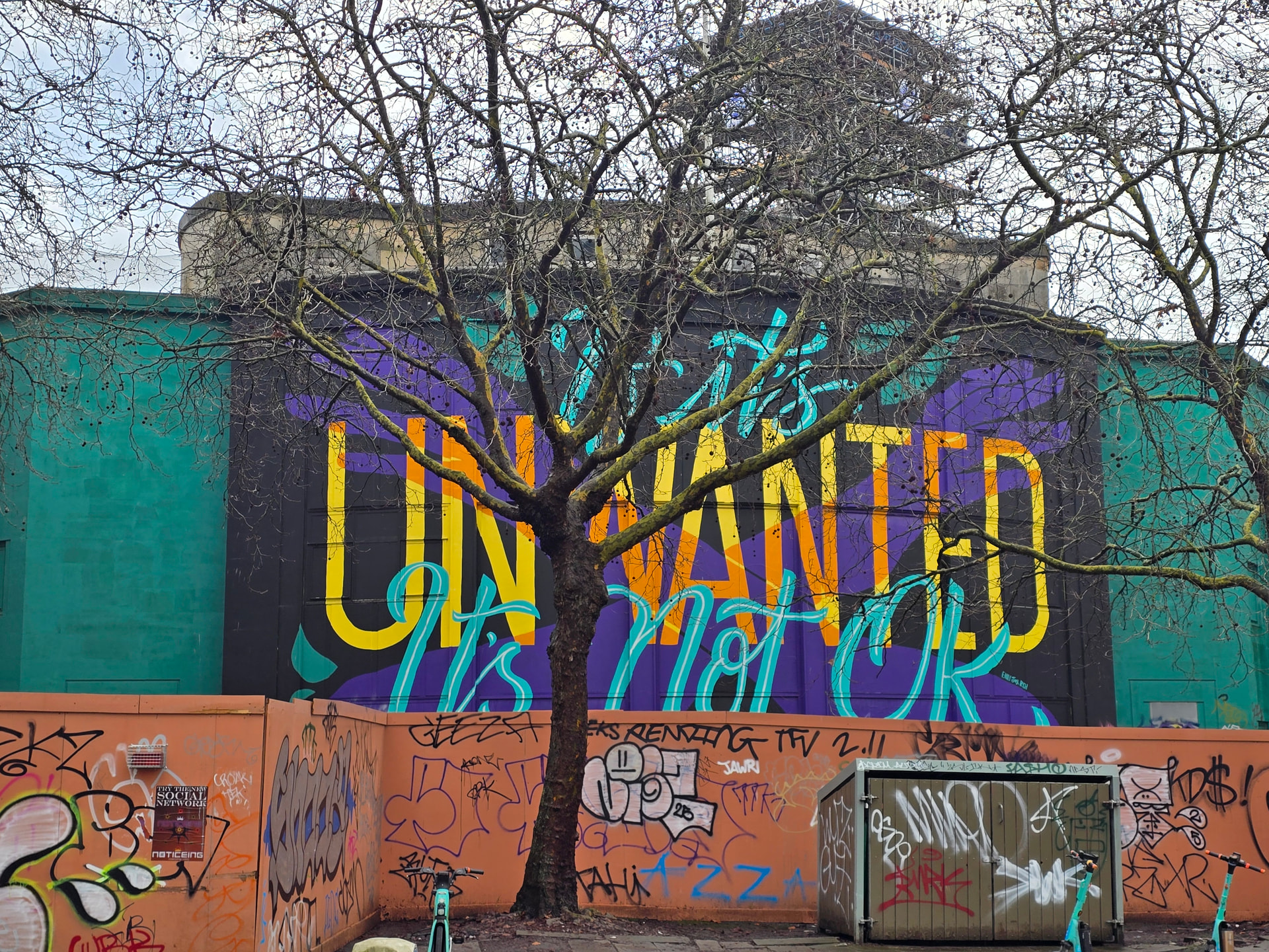 Now, it is possible that the obscuring it is because the building is about to be demolished or renovated, in which case the mural can be removed. Or it might be that the road in front of it is being torn up for a cycle path. Either of those cases might be what’s going on here:
